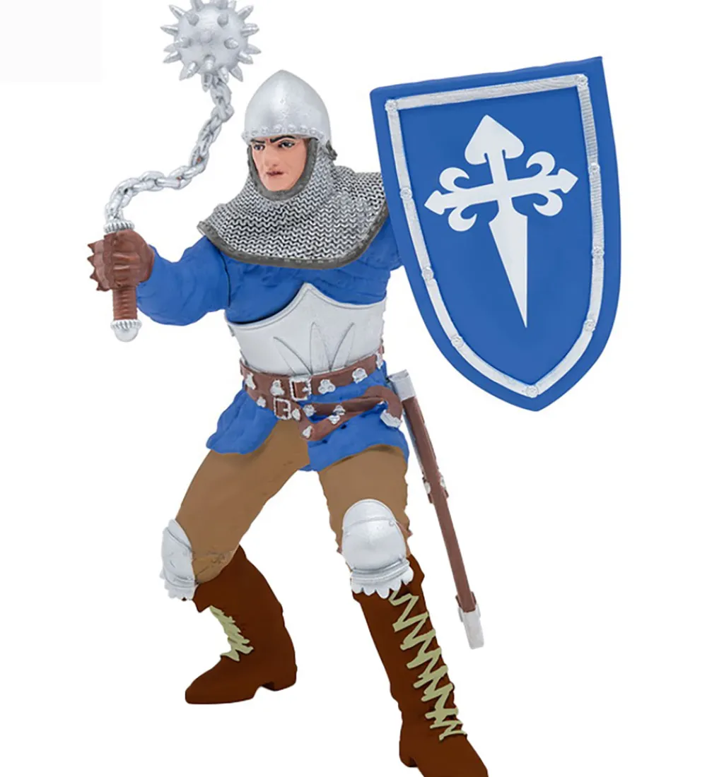 Flot Papo ridder med udrustning i blå, sølv og brun. Ridderen er kampklar med sin morgenstjerne og skjold i hænderne.
