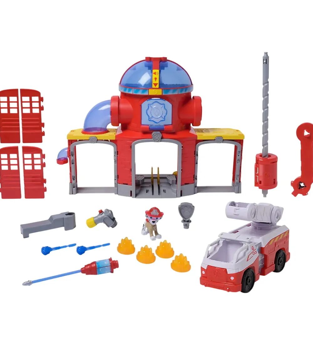 Paw Patrol brandstationen har forskellige aktivitetsområder, bl.a. en brandmandsstang som Marshall kan glide ned af, en brandbil med lys og lyd, samt kan brandbilen skyde “vand” afsted med de medfølgende vand-“pistoler”. Paw Patrol legesættet indbyder til mange timers leg og er perfekt til alle små fans af Paw Patrol.