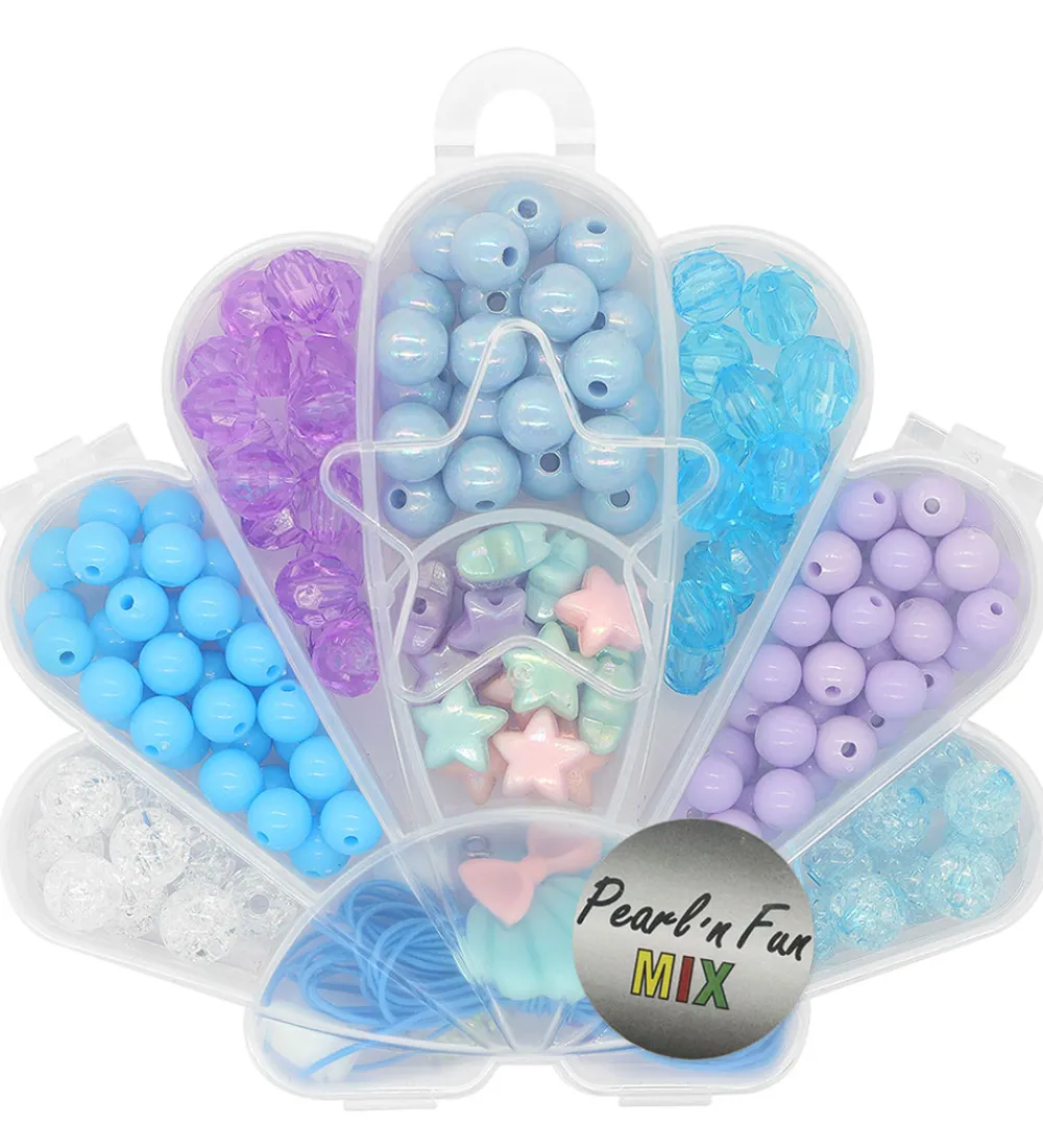Pearl N Fun perlerne kommer i en opbevaringsæske af plastik og formet som en musling med 9 rum og indeholder: