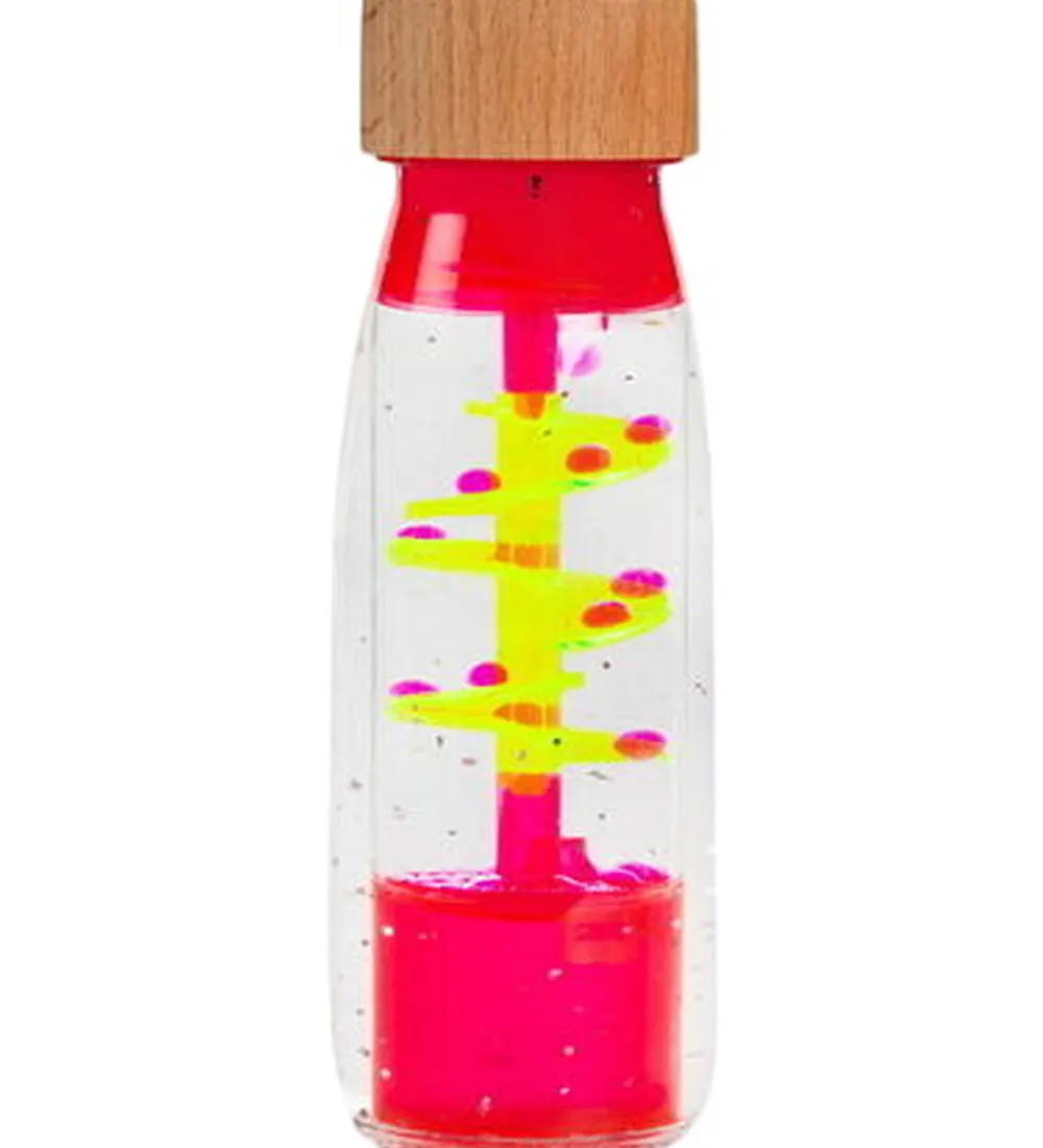 Fint Petit Boum sanselegetøj, der er formet som en flaske med et helt glat trælåg, og inden i flasken ses indholdet, som består af en klar og en pink, tykflydende væske samt konfetti og en neongul spiral.