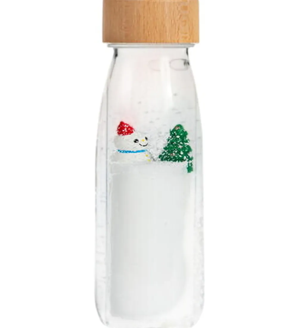Fint Petit Boum sanselegetøj, der er formet som en flaske med et helt glat trælåg, og inden i flasken ses indholdet, som består af en klar væske samt sne-konfetti og figurer af en en snemand og et jueltræ.
