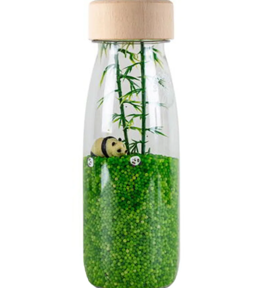 Fint Petit Boum sanselegetøj, der er formet som en flaske med et helt glat trælåg, og inden i flasken ses indholdet, som består af grønt konfetti, hvori der gemmer sig en panda og dens bambustræ.