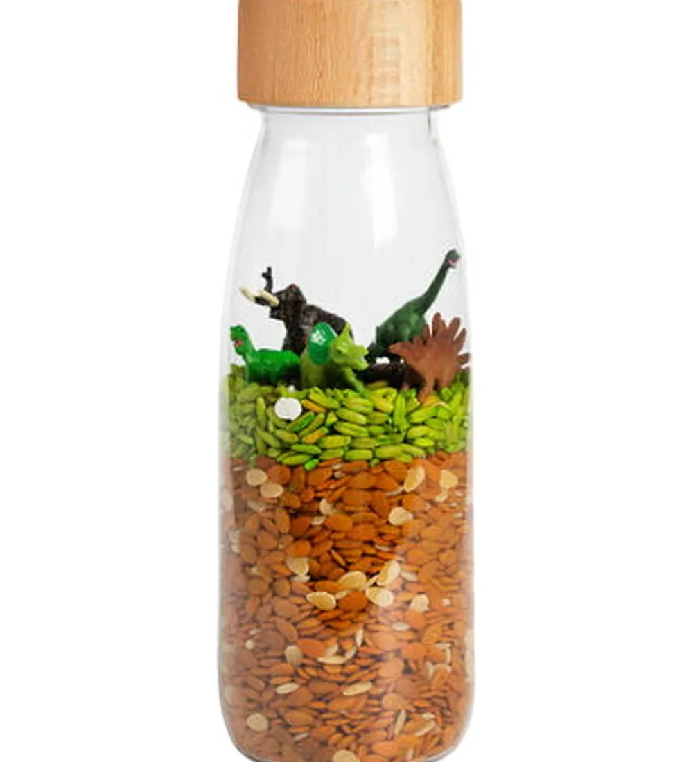 Fint Petit Boum sanselegetøj, der er formet som en flaske med et helt glat trælåg, og inden i flasken ses indholdet, som består af grønt og brunt konfetti, hvori der gemmer sig forskellige dinosaurer, som barnet kan udspionere i deres “naturlige” habitat.