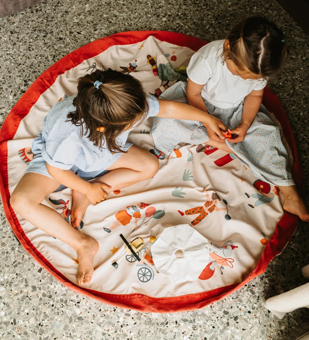 Charmerende Play&Go legetæppe og opbevaringspose med to-i-en funktion. Legetæppet er råhvidt med rød kant og dobbetsidet print med stjerner og cirkler på den ene side og cirkus-print på den anden side. Legetæppet har en rund facon med snore i siderne, som kan trækkes sammen, så legetæppet bliver til en opbevaringspose.