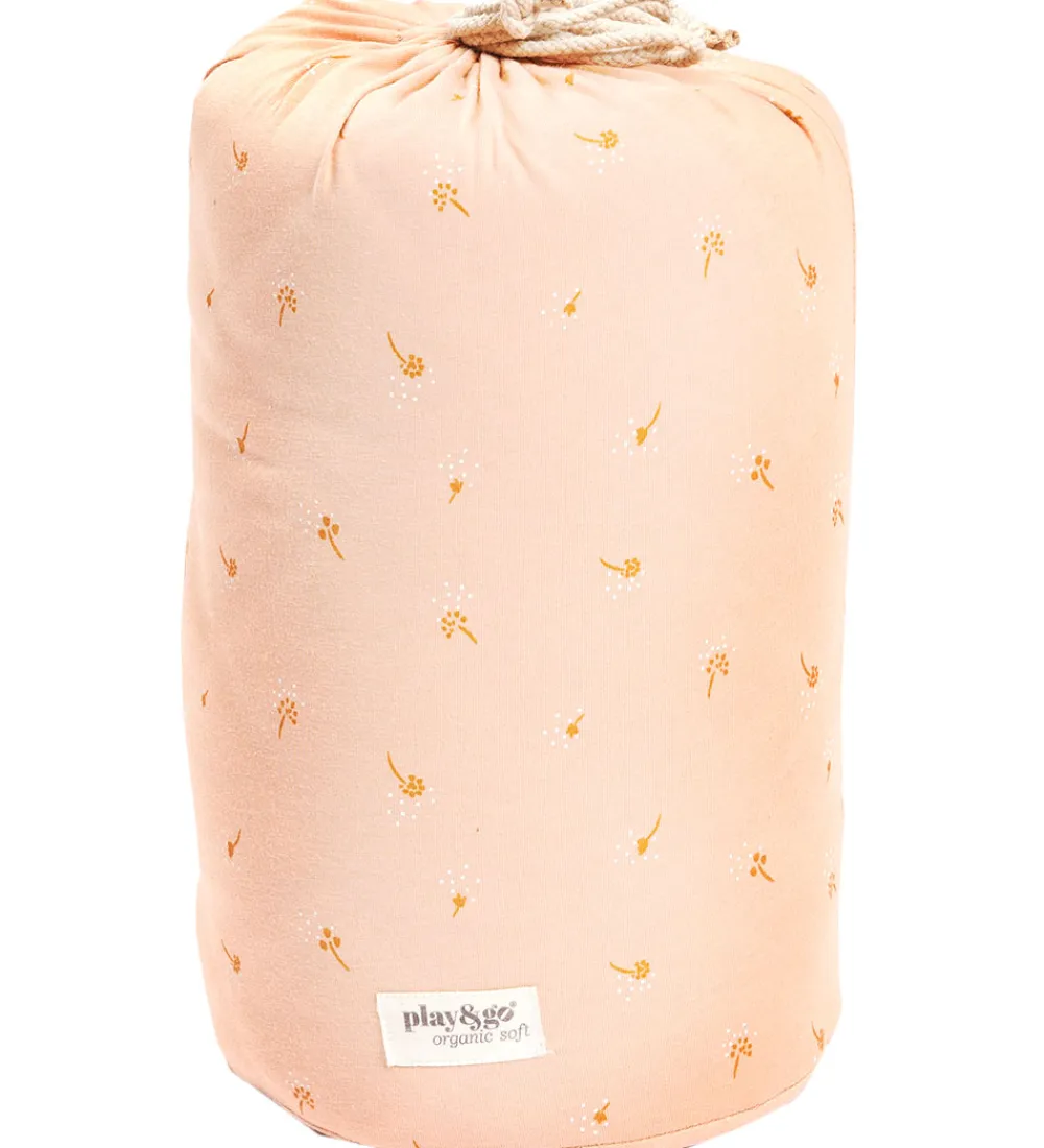 Flot Play&Go legetøjstæppe i rosa med et alloverprint af små, fine blomster og prikker i lysebrun og hvid.