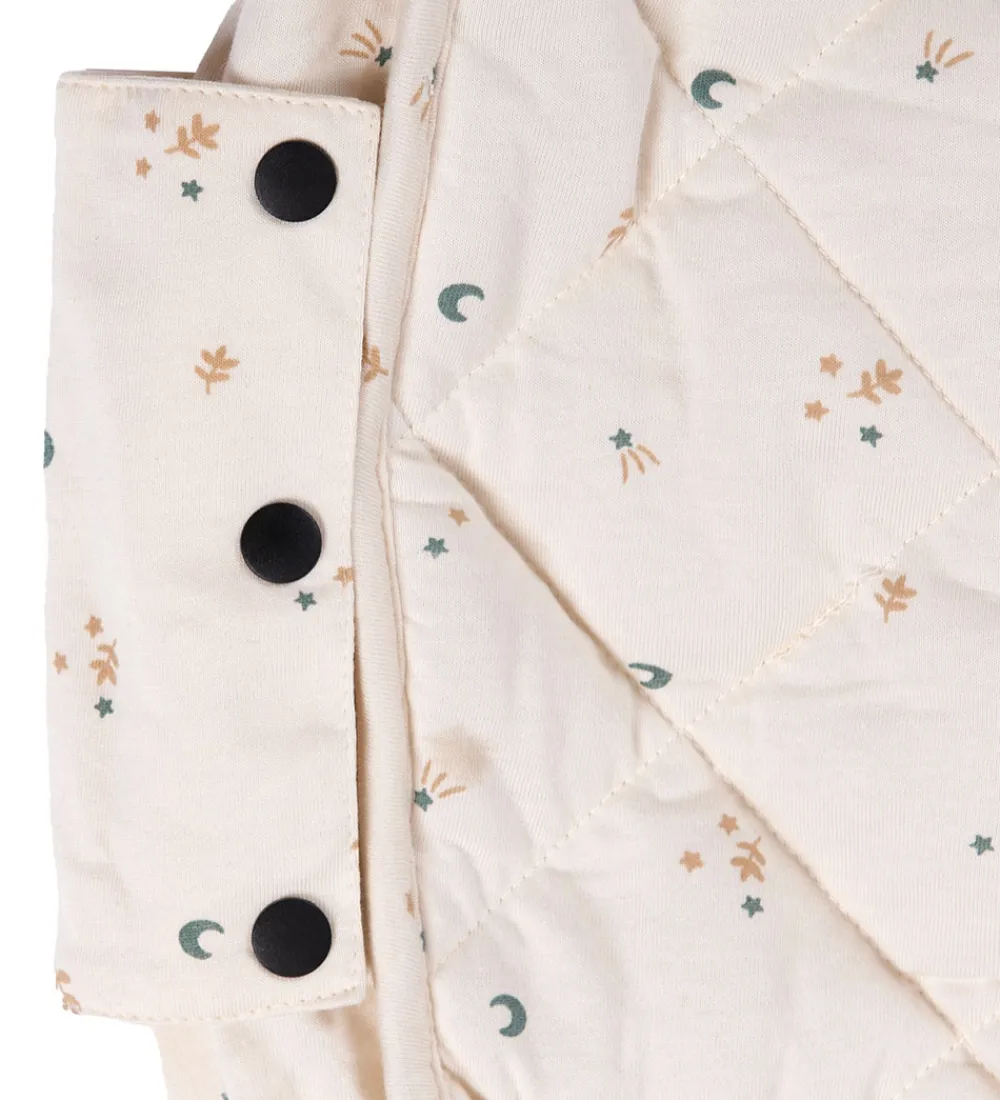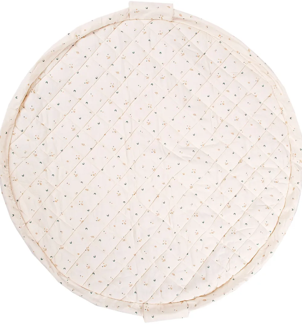 Flot Play&Go legetøjstæppe i cremehvid med et alloverprint af små, fine måner, stjerne og grene i blågrøn og lysebrun.