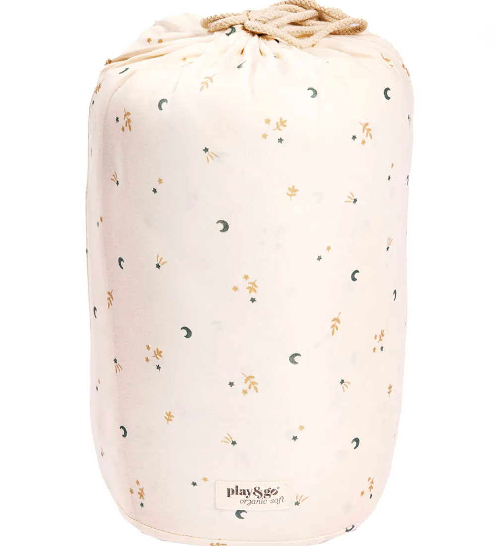 Play&Go legetøjstæppet er et stort cirkelformet stykke stof med en løbegang hele vejen rundt med en hvid snor, så man kan snøre tæppet sammen til en pose. I posen kan man opbevare sit legetøj, og når børnene synes, at legetøjet skal med ind i stuen, kan posen åbnes og legetæppet folder sig ud. Bagefter er det hurtigt og nemt at rydde op og lægge på plads. Legetæppet har en justerbar, aftagelig rem, så den nemt kan tages med rundt.