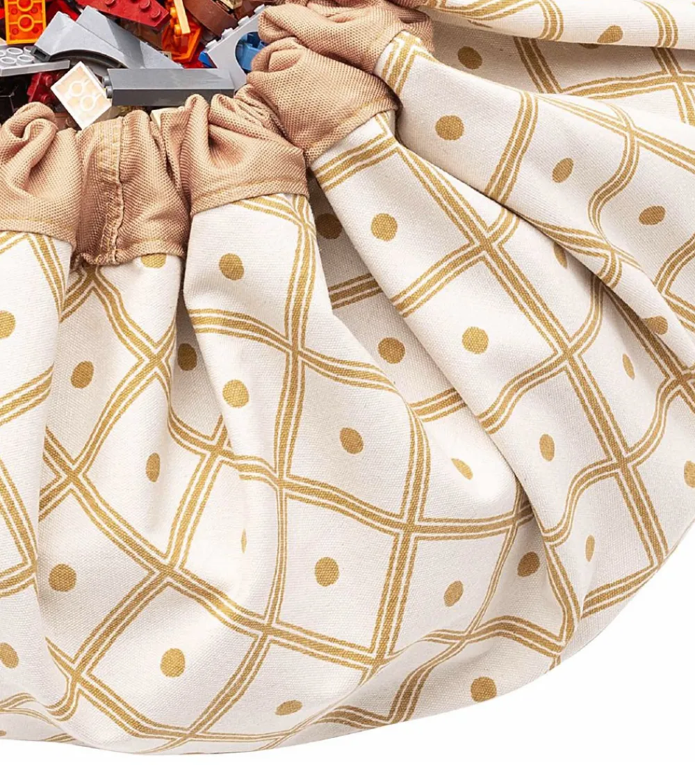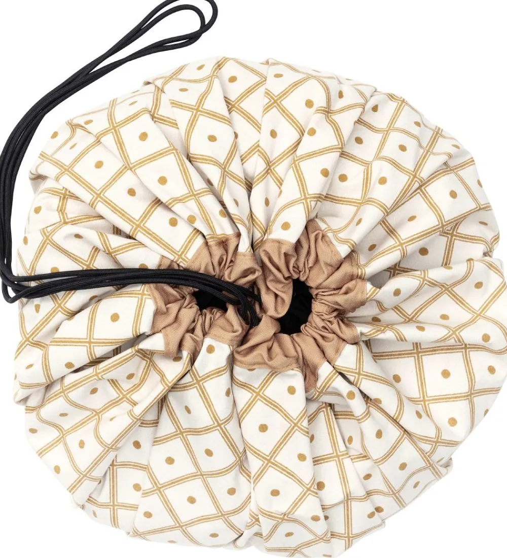 Smart Play&Go legetøjstæppe i cremefarvet kanvas med et flot karryfarvet mønsterprint på ydersiden.
