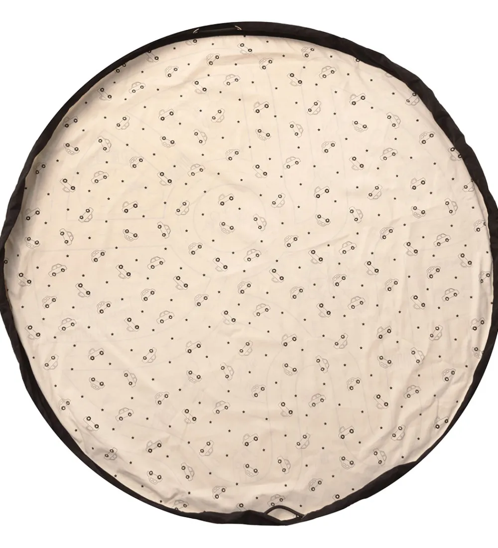Flot Play&Go legetøjstæppe i beige med sorte kanter og med forskellige print på inder- og ydersiden. Indersiden har et pint af en bilbane i et bymiljø, mens ydersiden har et sort alloverprint biler og små prikker.