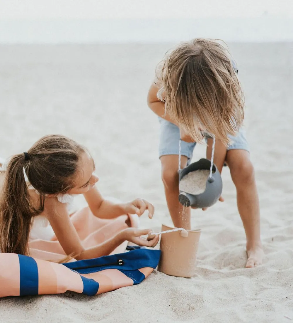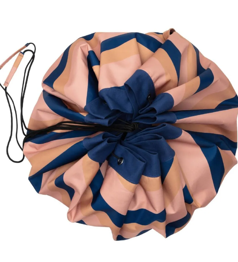 Praktisk Play&Go legetøjstæppe til udendørs aktiviteter i stribet brun, blå og beige, i en lækker PU-kvalitet.