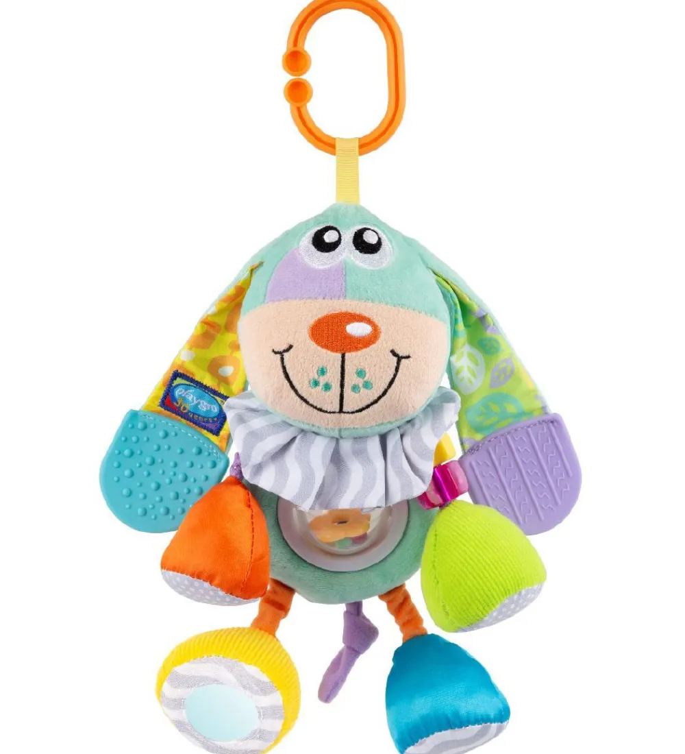 Sjovt Playgro aktivitetslegetøj med form som en blå hund, med detaljer i regnbuens farver.