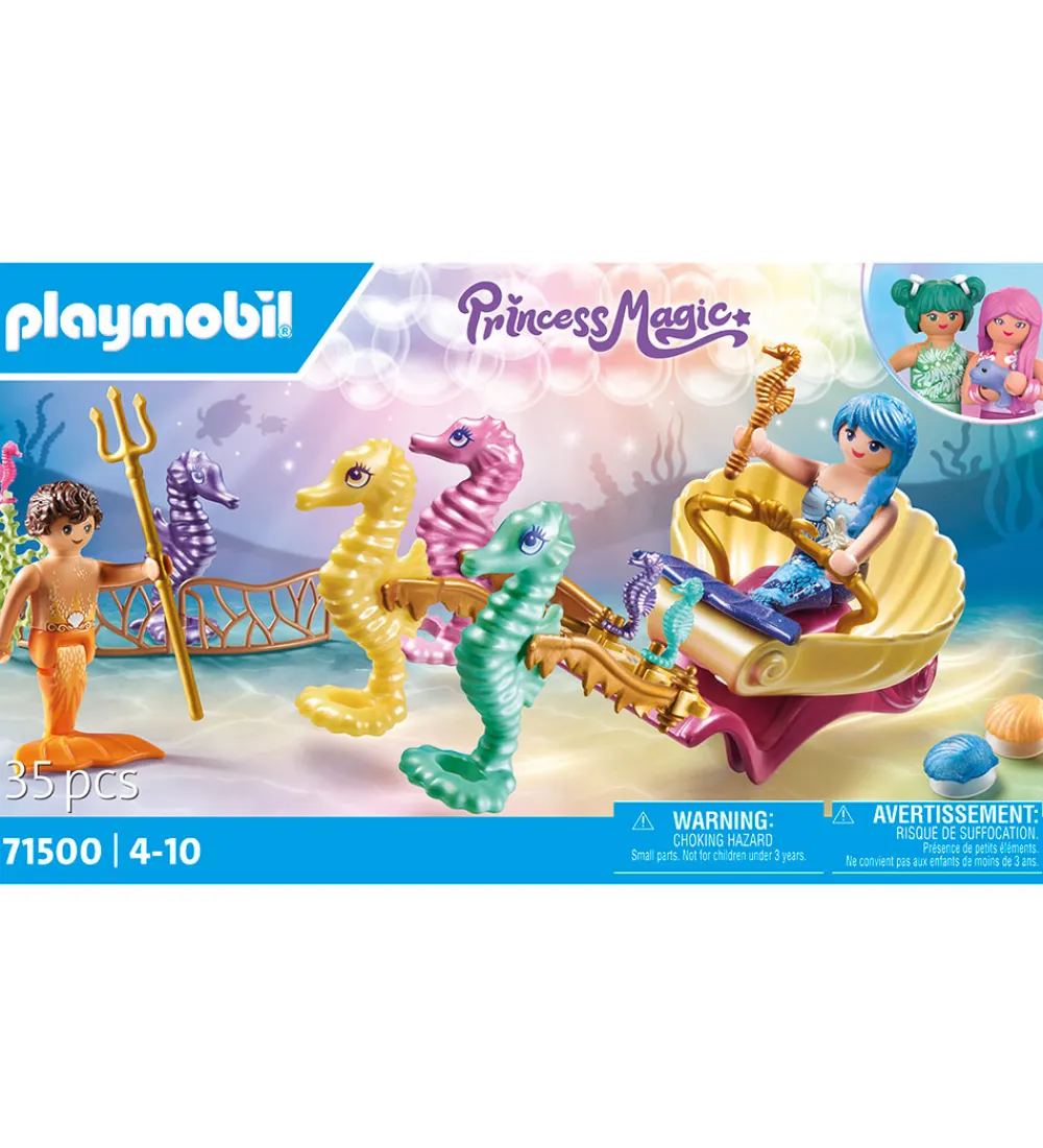 Fint Playmobil Princess Magic sæt med i alt 35 dele, der samles til to havfolk, en mand og en dame, fire søheste i forskellige farver, en søhestevogn, to muslingesugekopper og andet tilbehør.