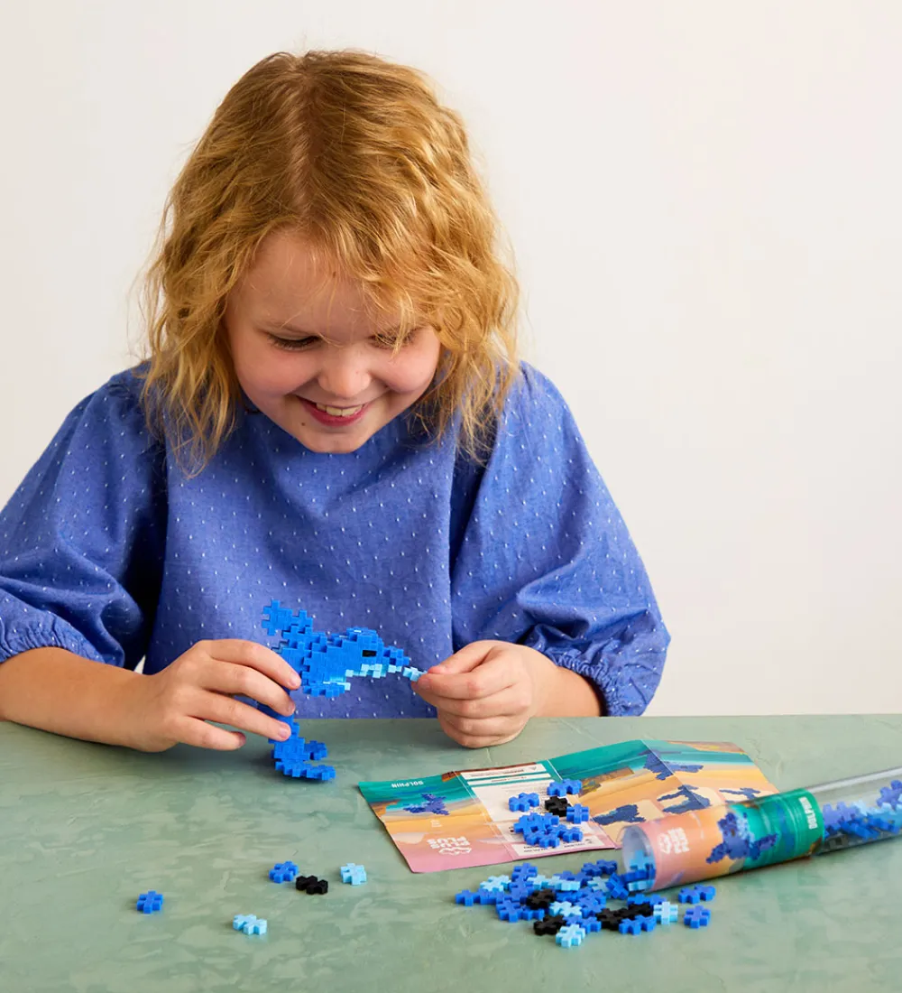 Sjove Plus-Plus klodser i et sæt med et delfin-tema, som indeholder 100 klodser samt en byggeinstruktion til inspiration.