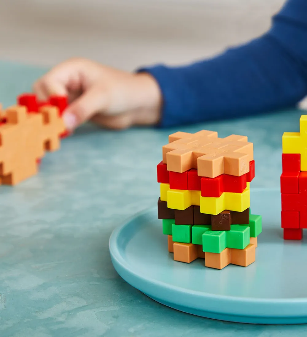 Sjove Plus-Plus BIG klodser i et sæt med et mad-tema, som indeholder 50 klodser samt en byggeinstruktion til inspiration.