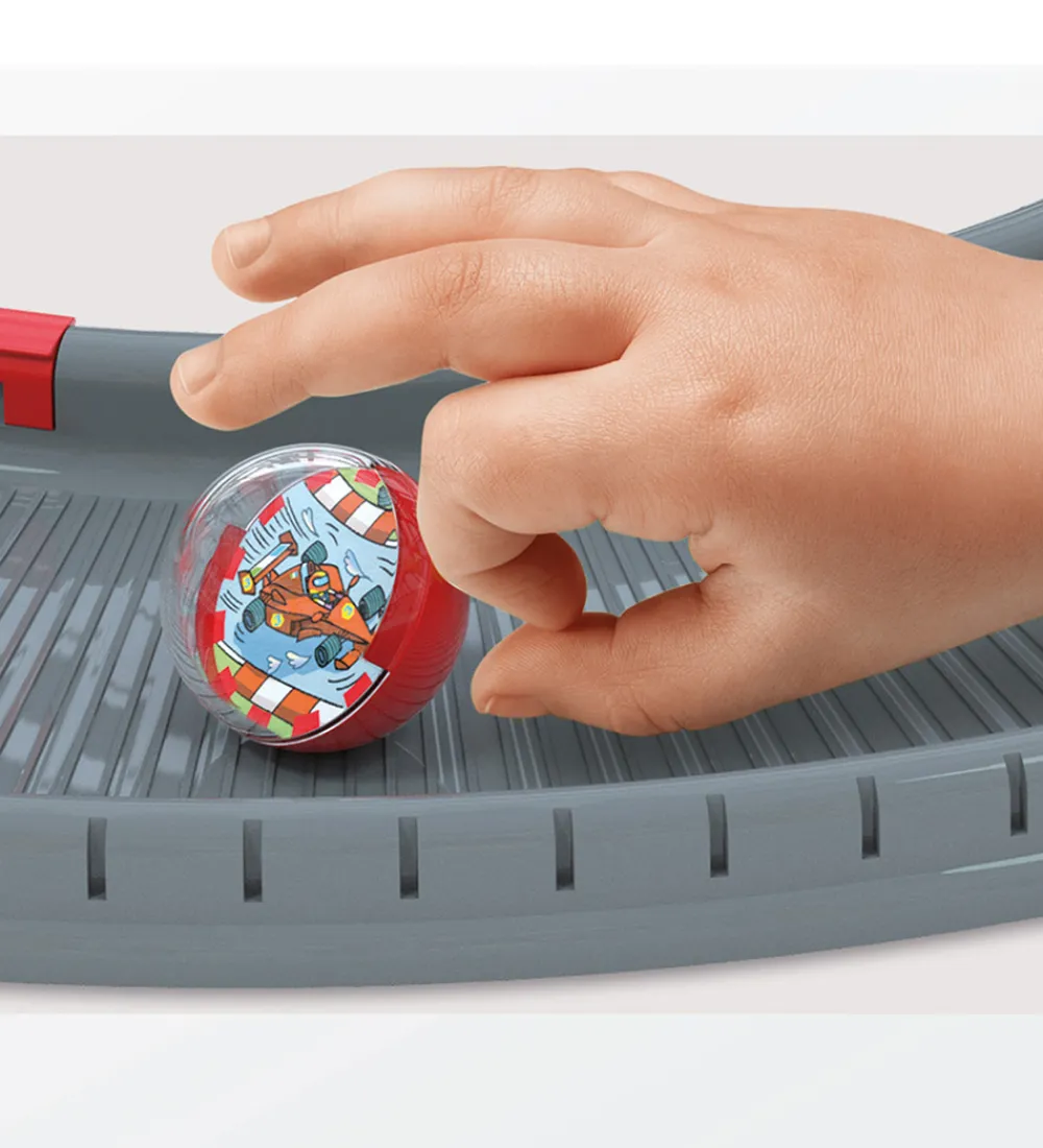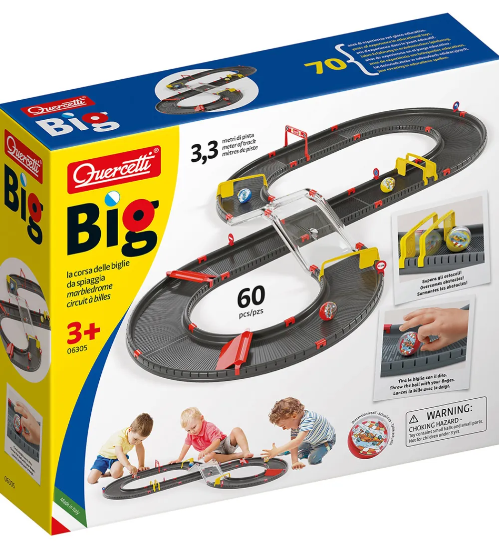 Sej Quercetti kuglebane opbygget som en racerbane i flotte farver, der kan samles på flere måder. I alt er der 3,3 meter kuglebanespor. I æsken medfølger: