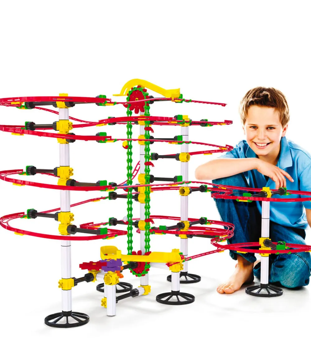 Sej Quercetti kuglebane opbygget som en rutchebaneforlystelse i flotte farver, der kan samles på flere måder. I alt er der 12 meter kuglebanespor. I æsken medfølger: