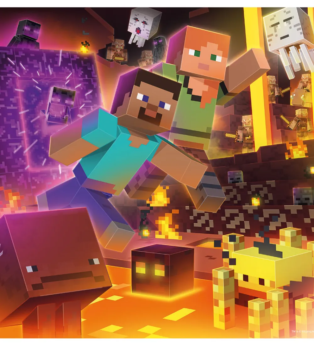 Puslespillene består af 49 brikker hver. Puslespillene har tre forskellige motiver, der viser populære figurer og scener fra Minecraft-verdenen. Det perfekte valg for små fans af det ikoniske spil.