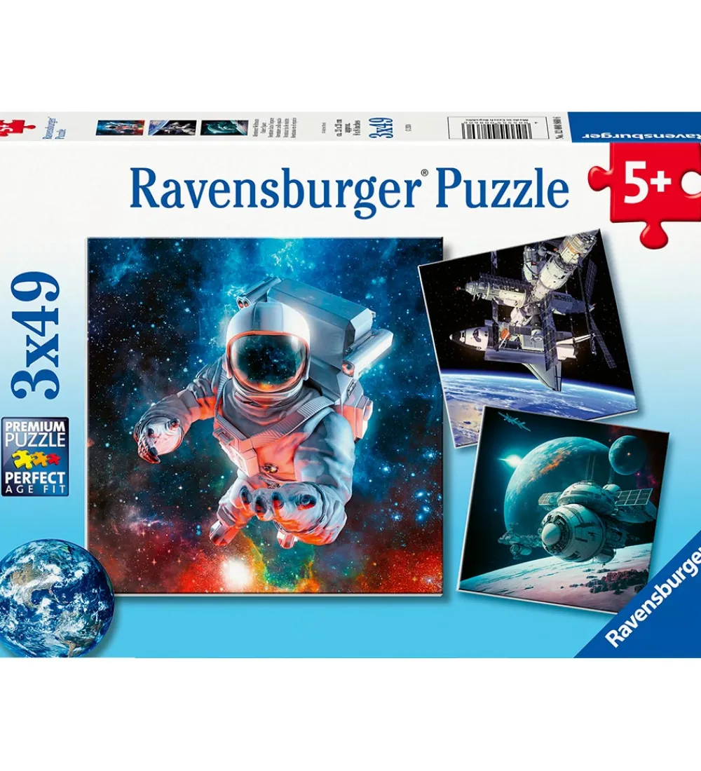 Fine Ravensburger puslespil i en pakke med 3 forskellige á 49 brikker. På alle tre er der motiver fra det ydre rum.
