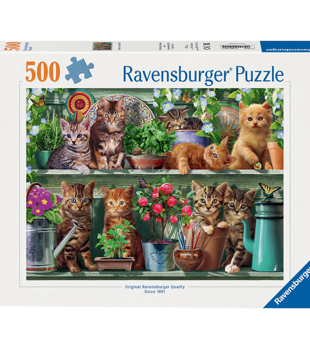 Flot Ravensburger puslespil med et motiv af søde katte blandt grønne planter og blomster.