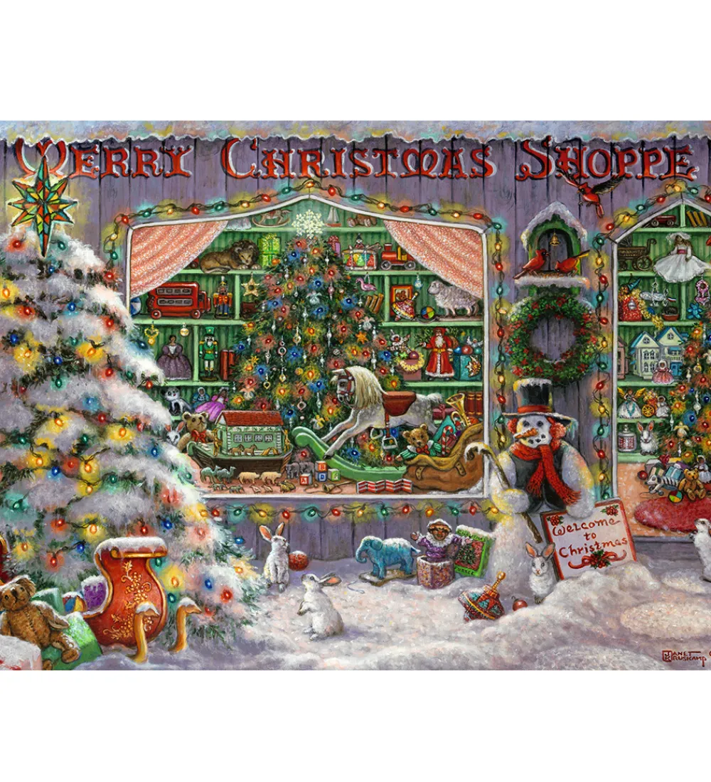 Charmerende Ravensburger puslespil med 500 brikker der viser et stemningsfuldt julemotiv. Puslespillet har detaljerede illustrationer af en hyggelig julebutik med farverige dekorationer. Perfekt til at skabe en varm atmosfære i vintermånederne.