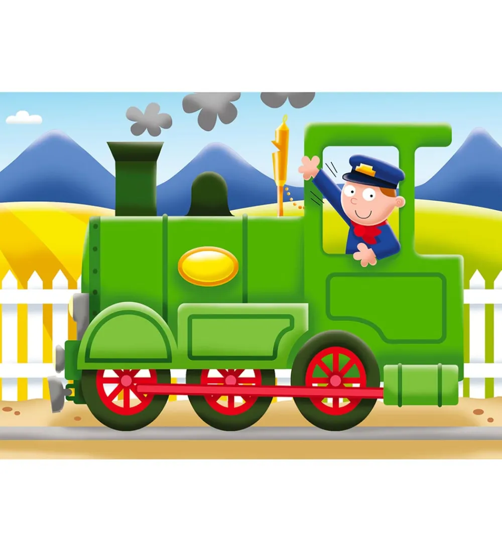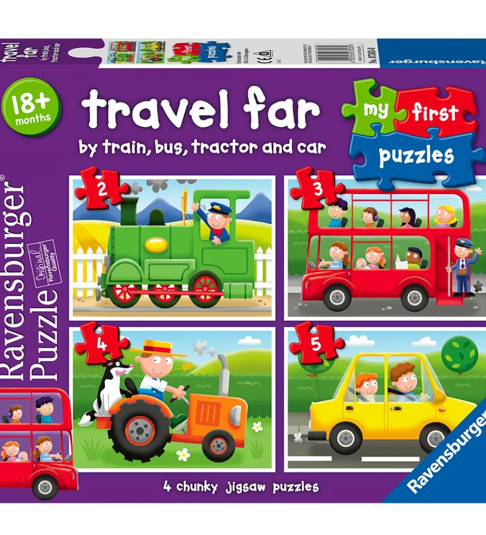 Skønt Ravensburger puslespil med 4 forskellige puslespil med søde, børnevenlige motiver med transportmidler.