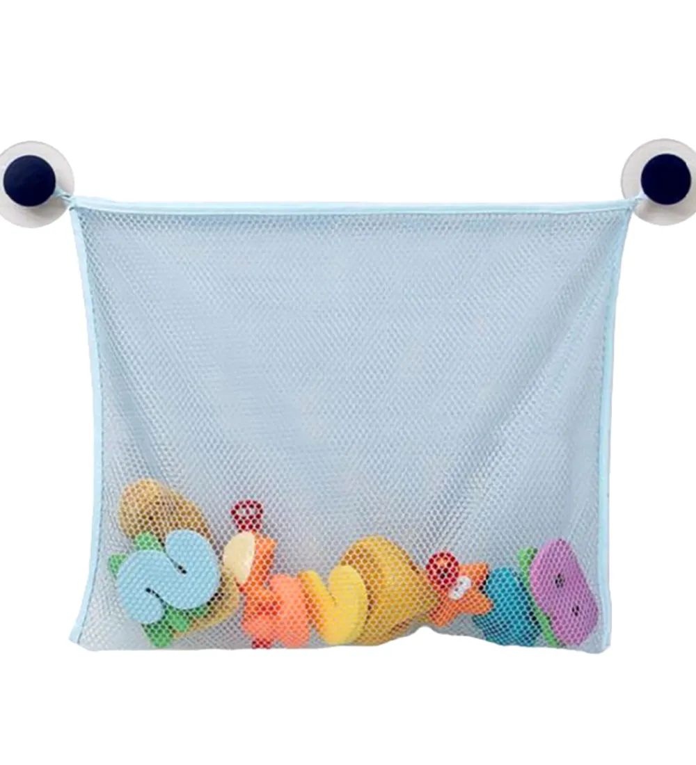 Praktisk Reer opbevaringsnet til badet i en lyseblå farve. Reer opbevaringsnettet sættes fast på badeværelsesfliserne med sugekopper og kan opbevare badelegetøj, svampe, børster og andre plejeredskaber. Opbevaringsnettet forhindrer skimmelvækst og sikrer hurtig tørring.