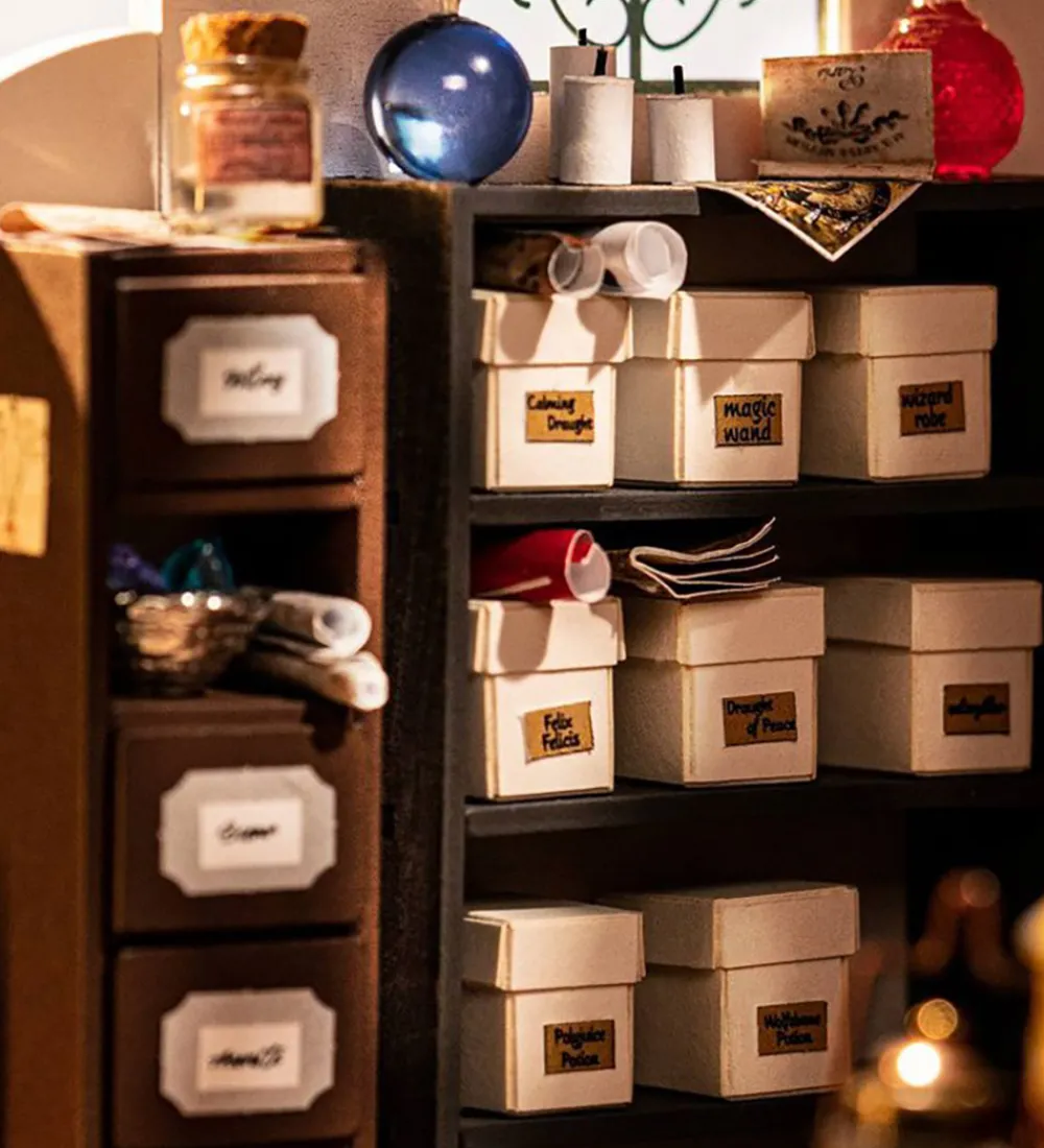Udsøgt Rolife miniature-diorama, der forestiller en lille, fortryllende magi-butik med utrolige detaljer.