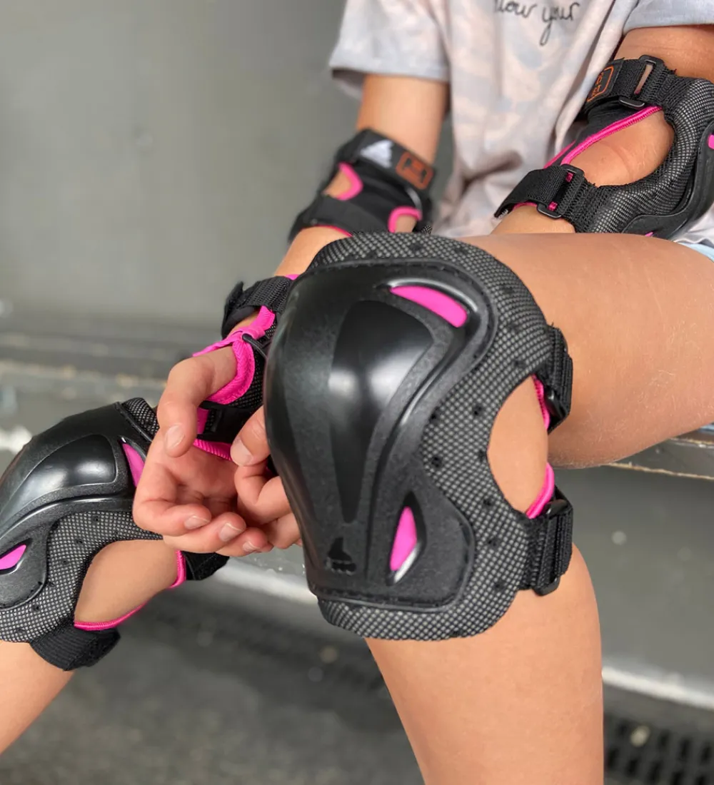 Smart Rollerblade beskyttelsessæt i sort med pinke detaljer, bestående af knæ, albue og håndledsbeskyttere.