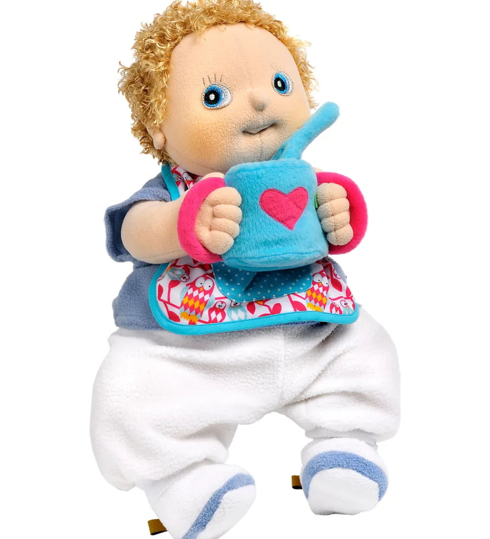 Farverigt Rubens barn madsæt bestående af en hagesmæk i blå med mønster i lyse nuancer, en kop i blåt plys med et pink hjerte samt en ske i blåt plys. Perfekt til detaljeret leg.