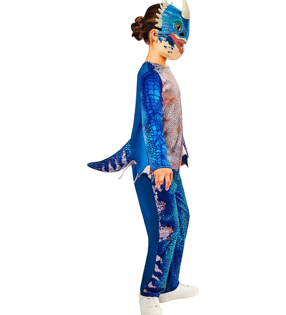 Sejt Rubies udklædning med et kostume og en maske, så barnet kan klæde sig ud som Nadder fra How to train your Dragon.