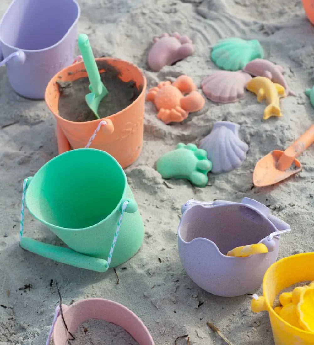 Schrunch sandformene er lavet af blødt, fleksibelt og foldbart silikone, så de er lette at have med i strandtasken. Sandformene forestiller en fod, en krabbe, en muslinge skal og en delfin.