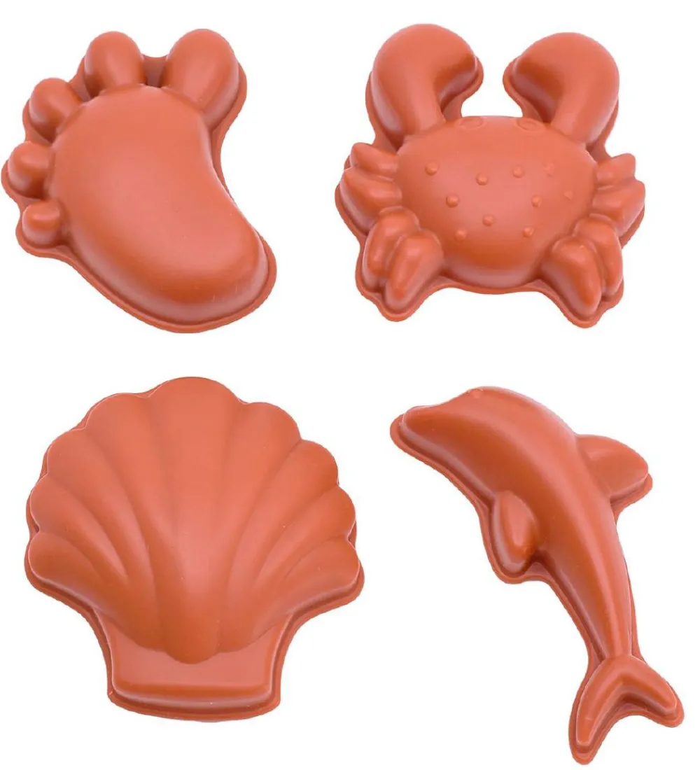 Scrunch sandformene er i en god silikone kvalitet og består af fire forme af en fod, en krabbe, en delfin og en skal.