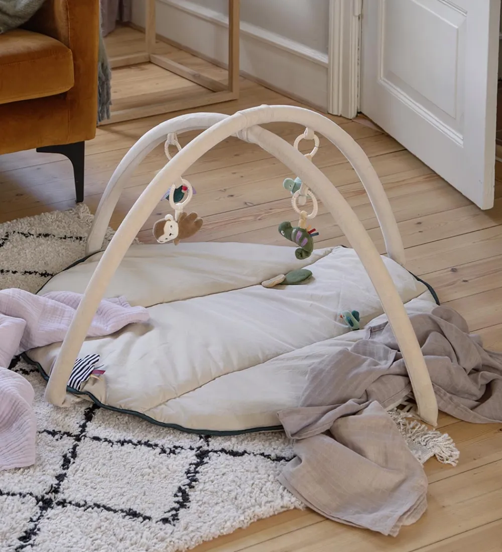 Selve stativet sættes nemt og hurtigt fast, og kan let fjernes igen, så aktivitetstæppet kan bruges alene. Stativet har plads til fire forskellige vedhæng, som nemt hægtes på med elastikkerne på de medfølgende dyr, så de kan placeres efter eget ønske.