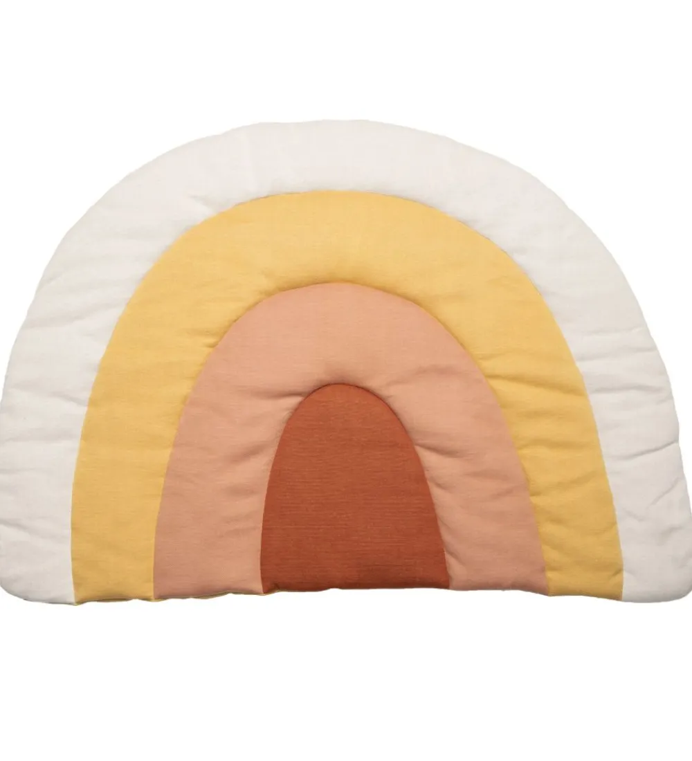 God Sebra legemadras i en strikstruktur med form som en regnbue i råhvid, gul, rosa og mørkerosa.