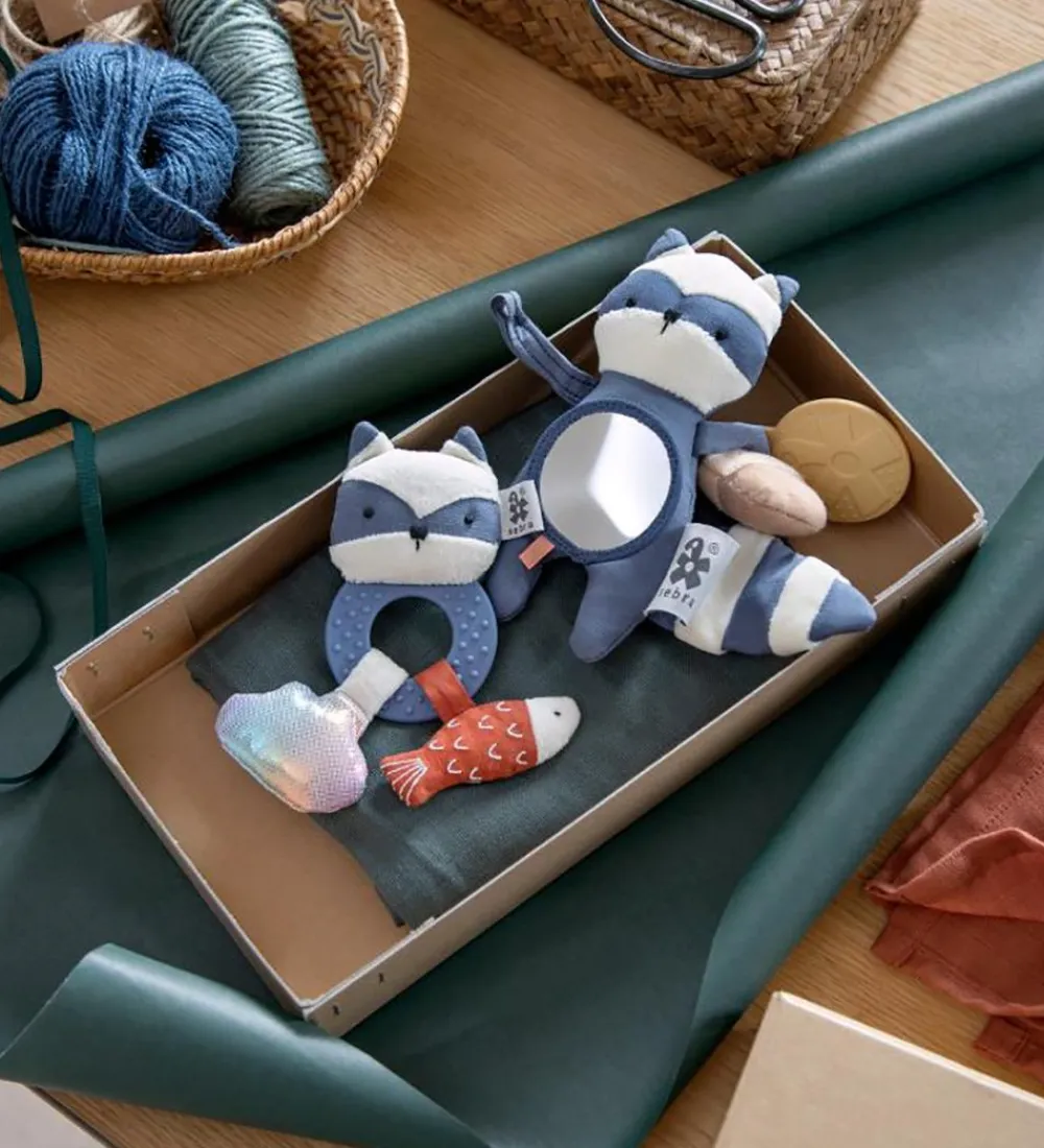 Sebra aktivitetsranglen består af en bidering med knopper, med et vaskebjørnshoved i toppen samt en fisk og en sky, som er sjove og lærerige for de små at lege med.