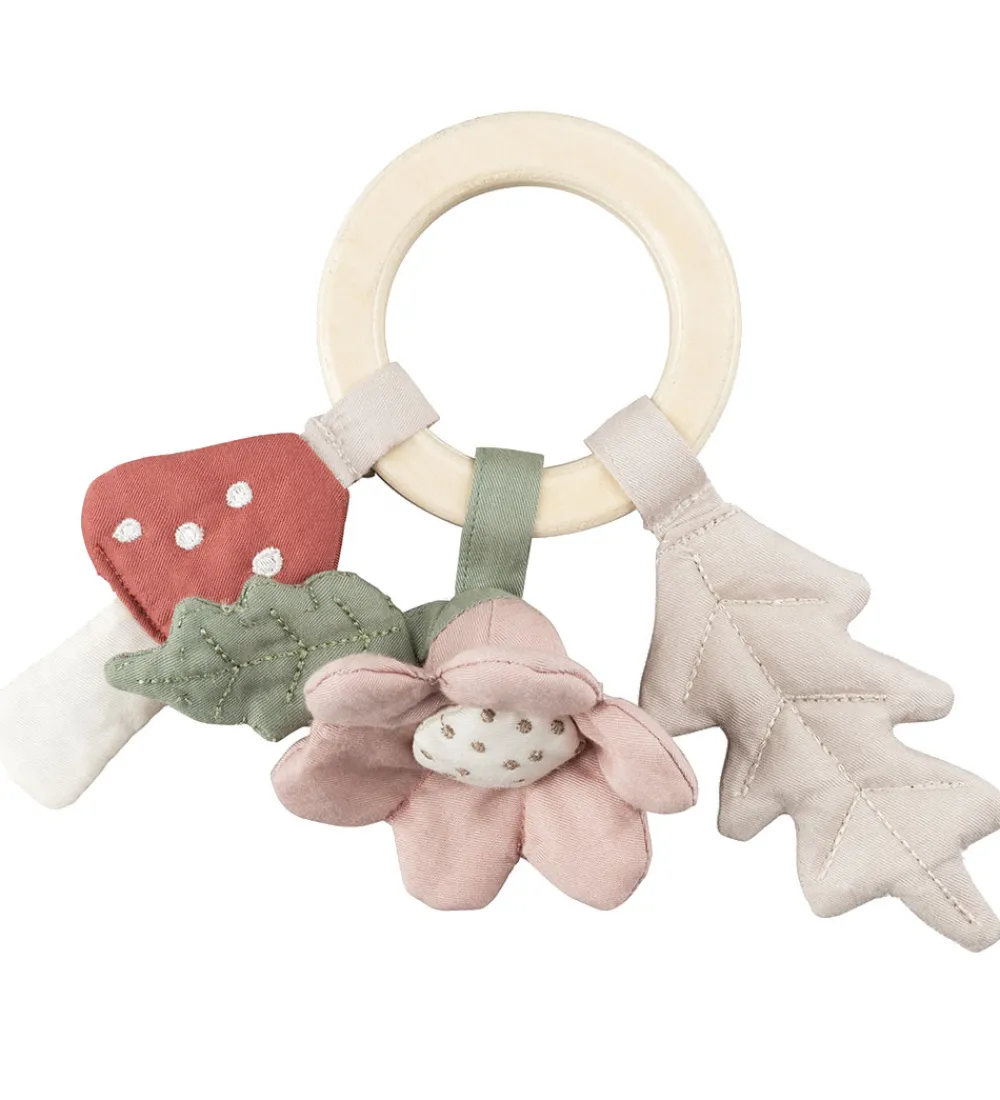 Sød Sebra rangle med vedhæng formet som en rosa blomst, en rød og hvid svamp og et beigefarvet blad.