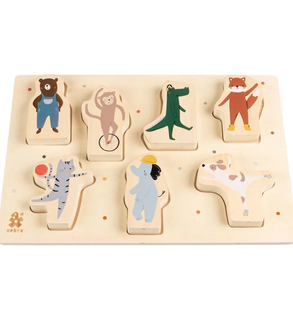 Sebra puslespillet består af syv brikker, som har hver sin unikke form og skal placeres i de tilsvarende huller i puslepladen. Puslepladen har gode afrundede kanter.