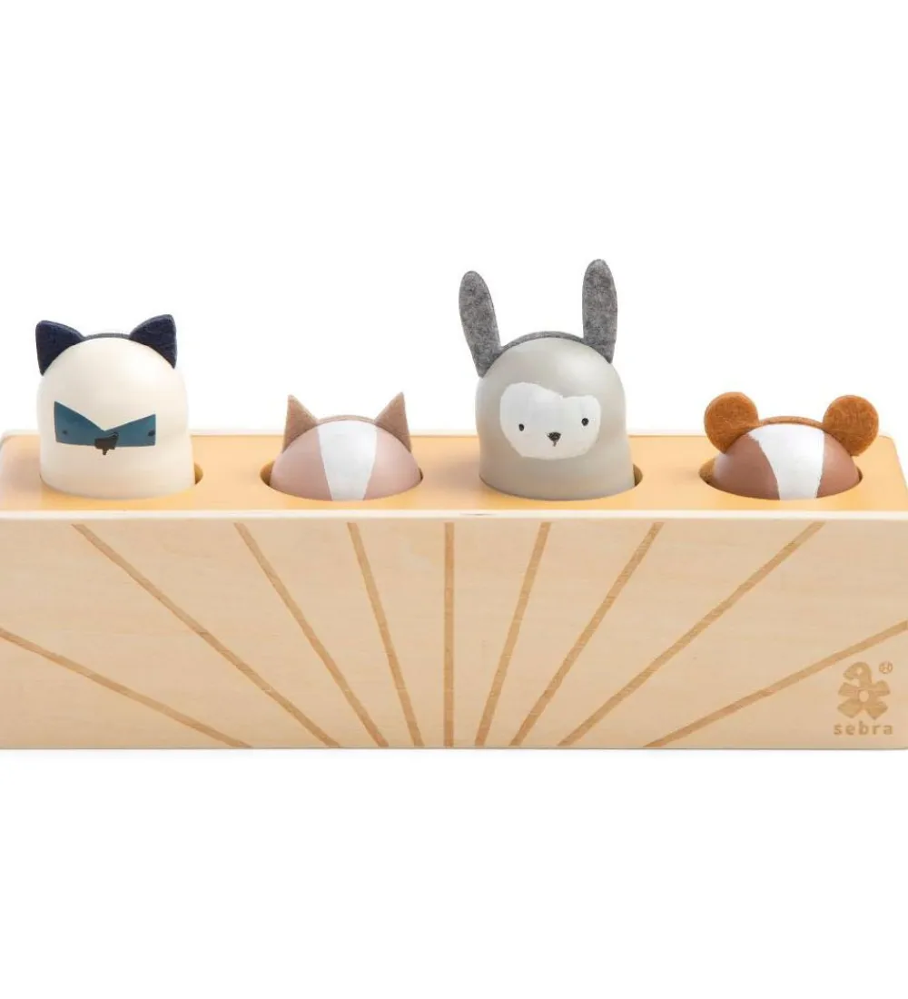 Sødt Sebra pop up legetøj bestående af en regtangulær kasse med fireforskellige trædyr i.