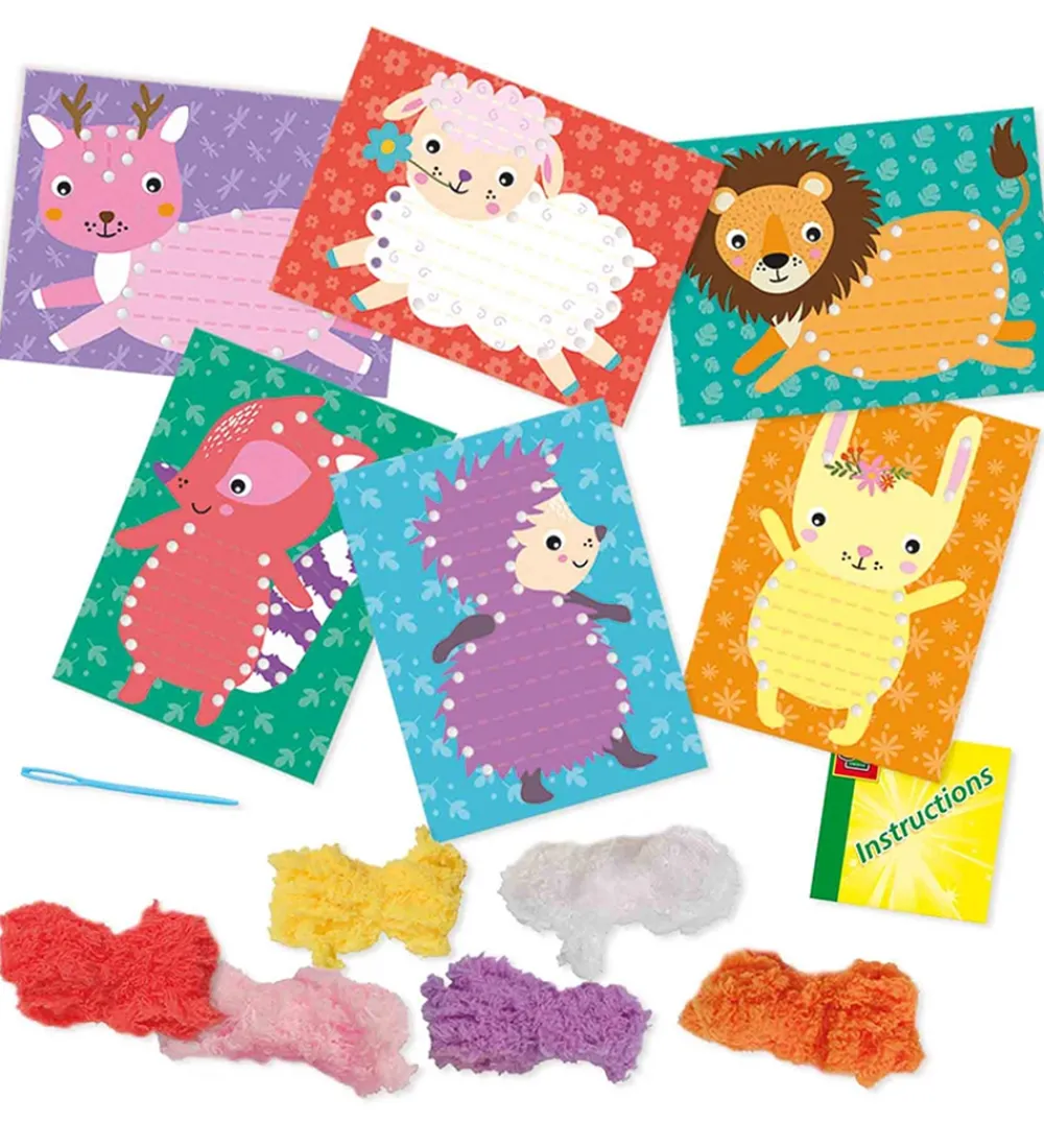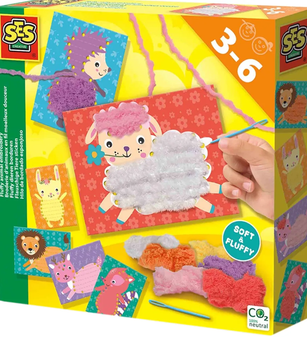 Fint SES Creative broderi sæt bestående af plader med dyr, garn og en plastiknål.