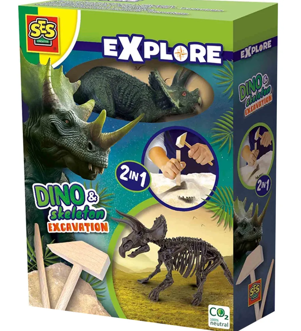 Fedt SES Creative udgravningssæt bestående af et dinosaurskelet man kan grave frem med en hammer og mejsel, hvor man derefter kan sætte skelettet sammen.