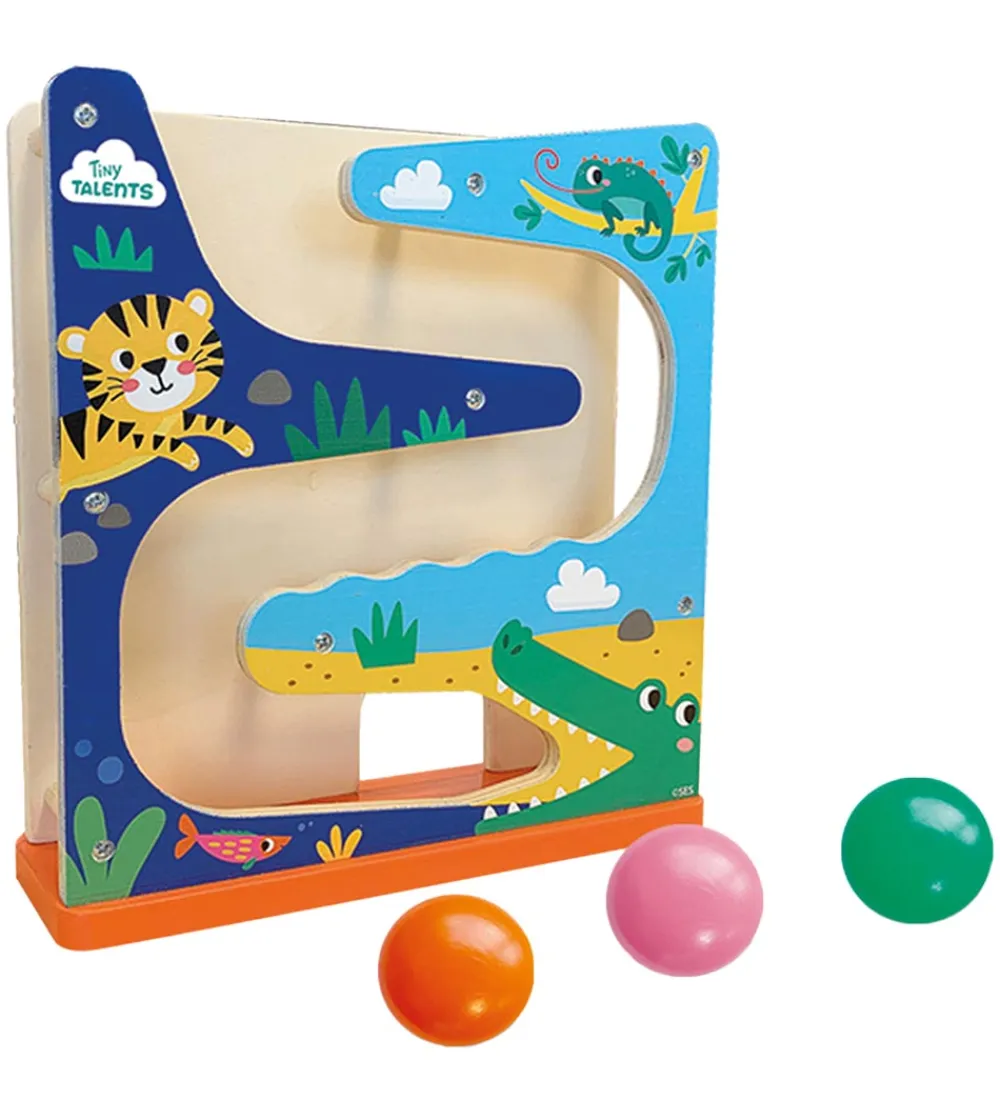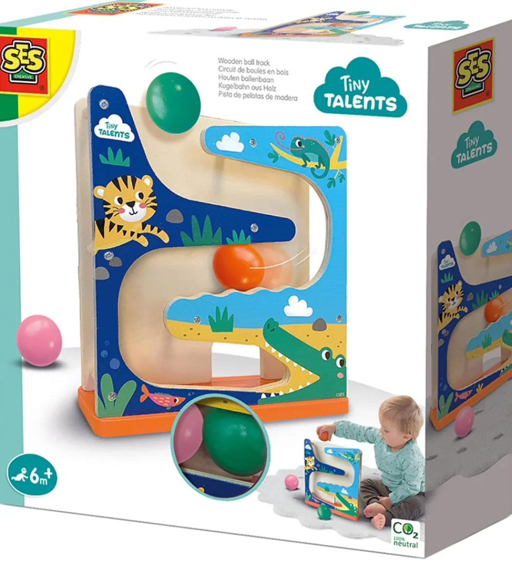 SES Creative kuglebane vil holde det lille barn underholdt i timevis med de tre trækugler. Sæt bolden øverst på trærammen og se den rulle ind i krokodillens mund.