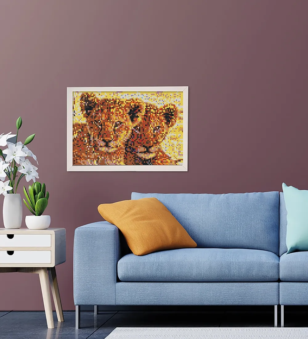 Flot SES Creative strygeperlesæt bestående af 7.000 perler og seks firkantede perleplader, der tilsammen kan laves til et smukt kunstværk med motiv af løveunger. Der medfølger selvfølgelig en trin-for-trin instruktionsmanual.