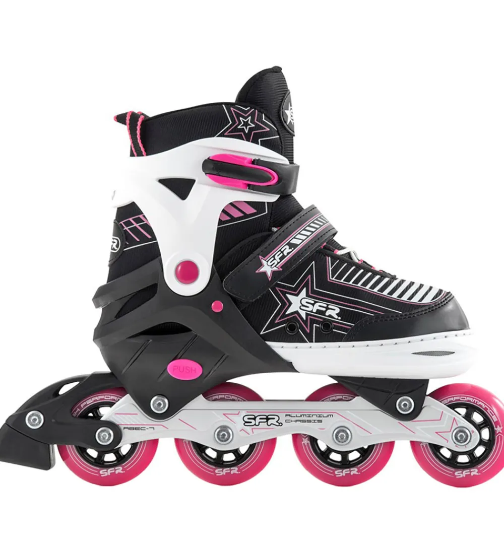 Seje SFR rulleskøjter i sort med mønster og logo i pink og hvid.