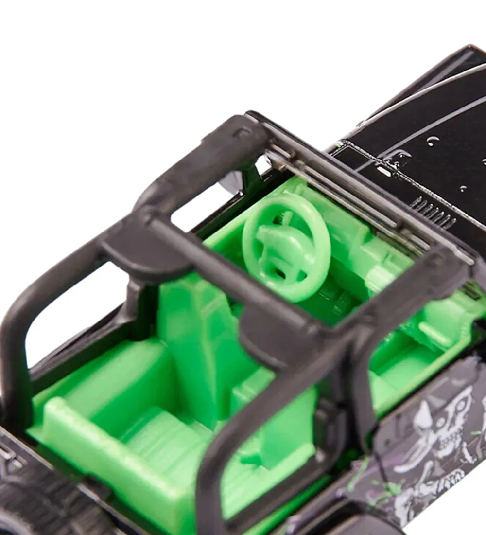 Stilfuld Siku bil i sort med grønne detaljer og et dristigt print af en karakter på siden.