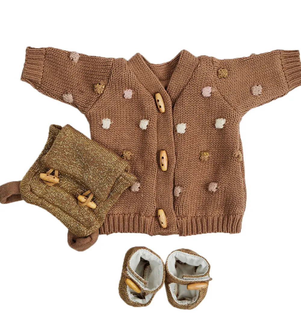 Sødt Smallstuff dukketøj bestående af en brun, strikket cardigan med prikker, guld glimmer sko, samt en guld glimmer rygsæk perfekt til dukkerne.