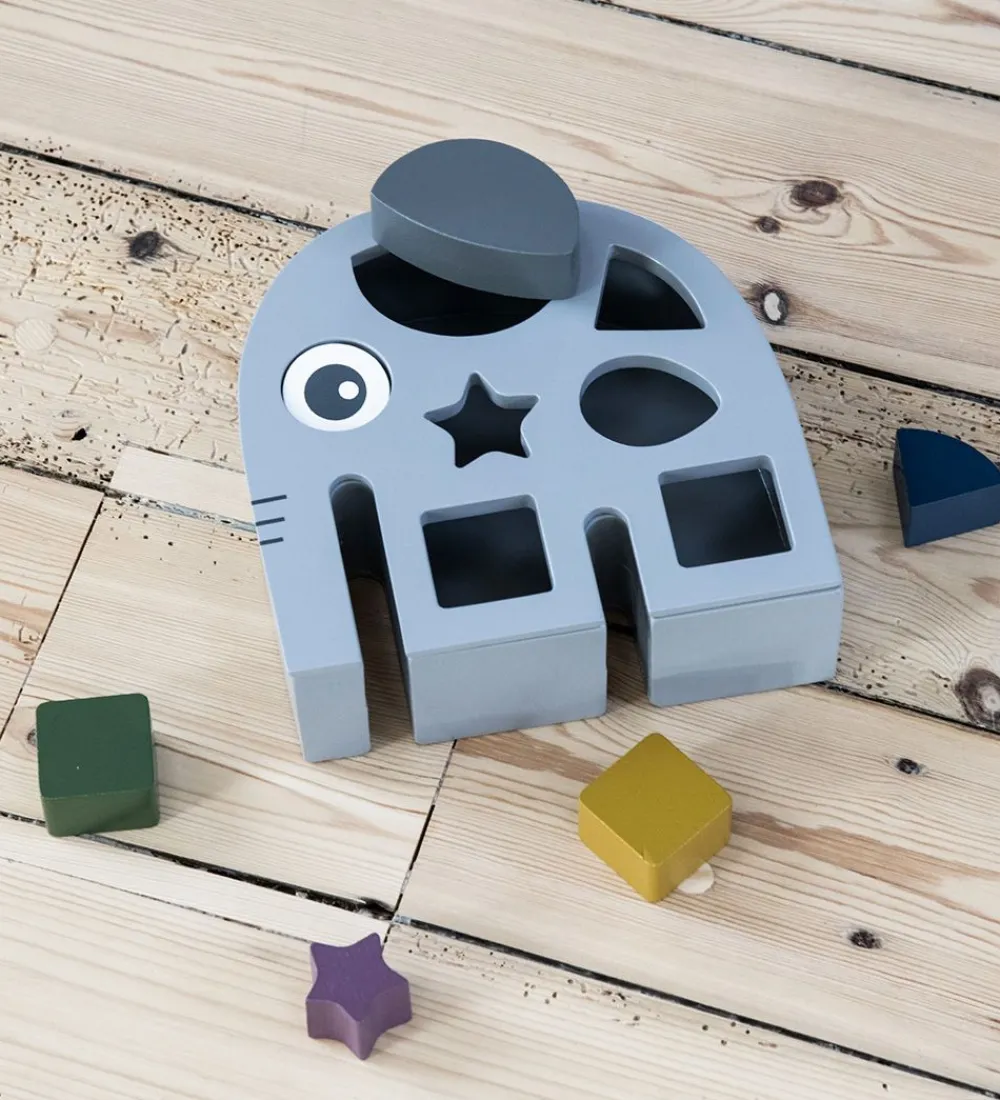 Underholdende Smallstuff puttekasse i gråt træ med form som en elefant.