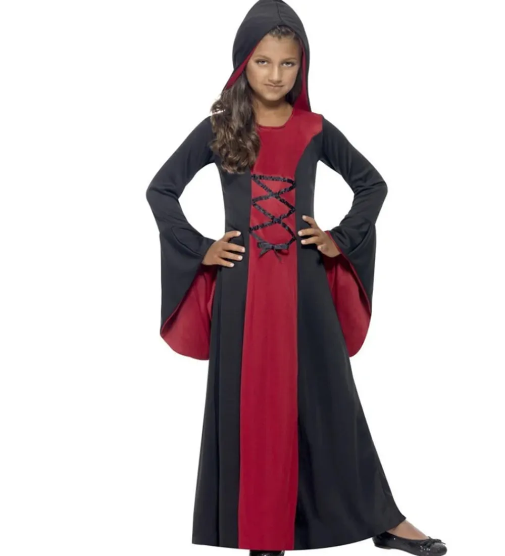 Smuk Smiffys udklædning bestående af en rød og sort kjole med store ærmer, samt en lang hætte. Den dekorative snøring på fronten fullender looket.