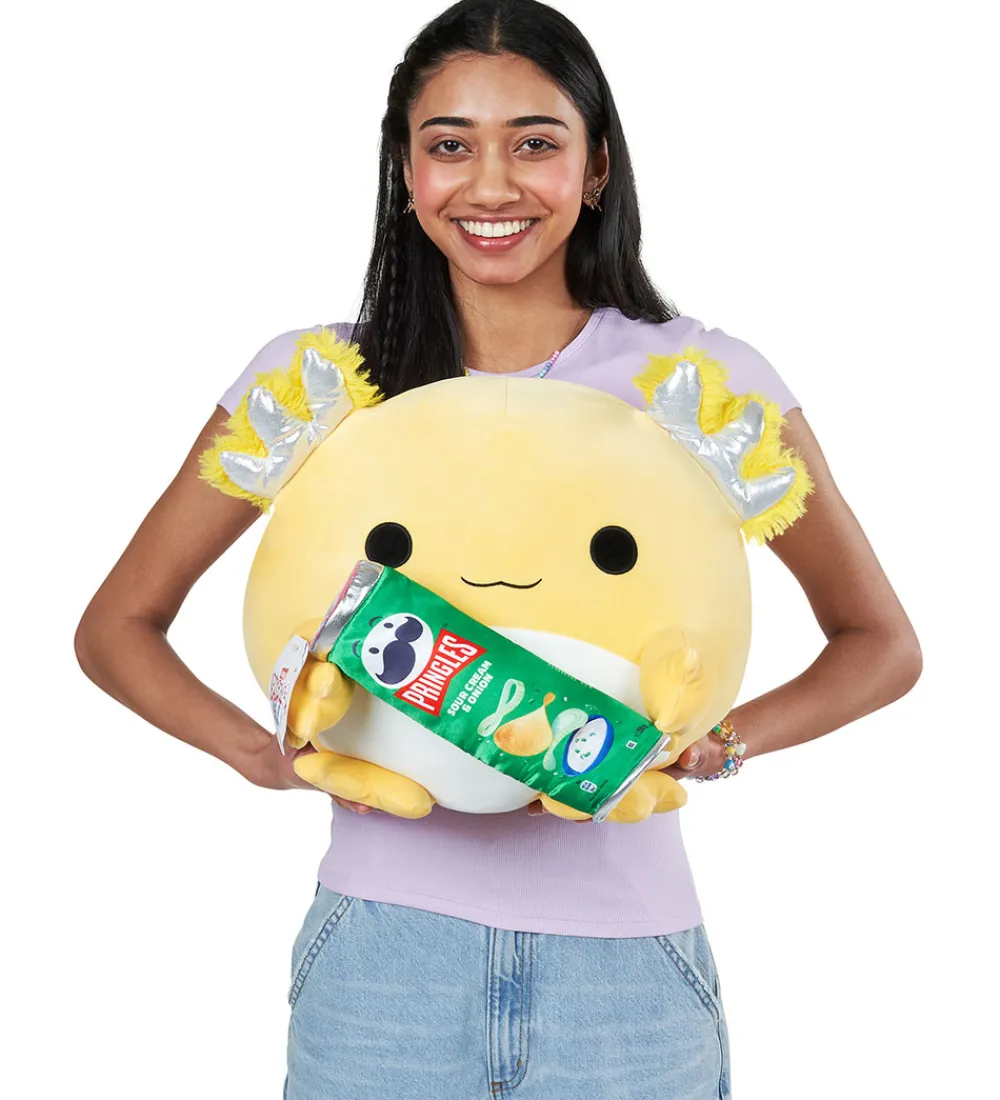 Skøn Snackles bamse formet som et fantasidyr i gul og hvid med grønt rør med Pringles mellem hænderne.