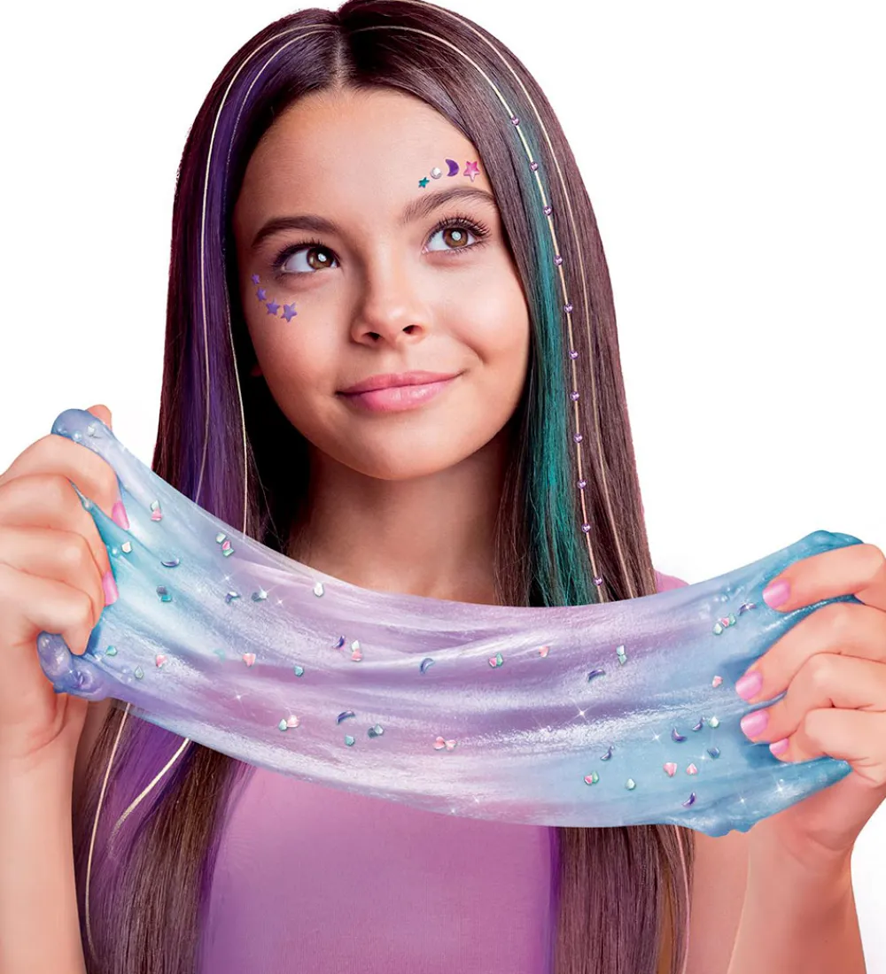So Slime DYI-slimet er sjovt at lave selv og tilbyder mange timers leg. Bland slimet (slimpulver + vand + farve) ved at ryste det sammen i en slim-shaker og tilføj dekoration fra poserne.