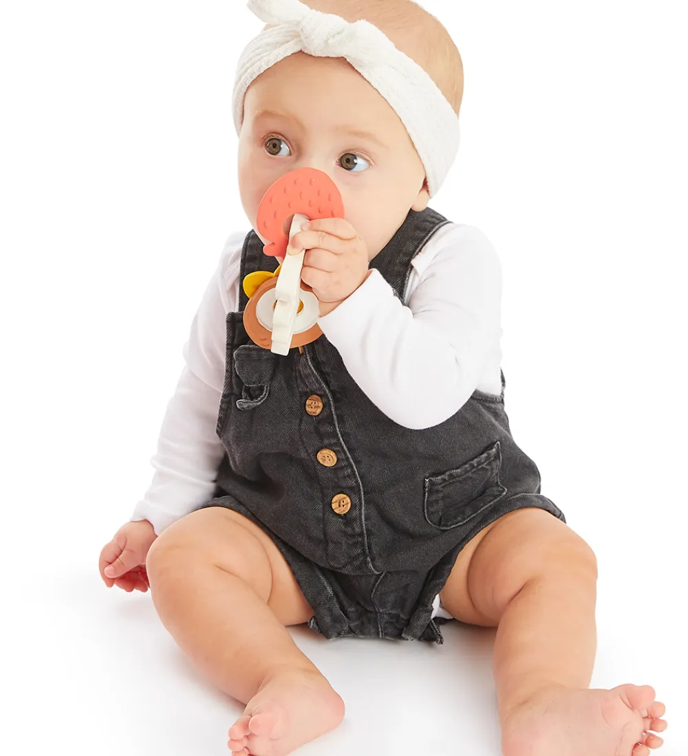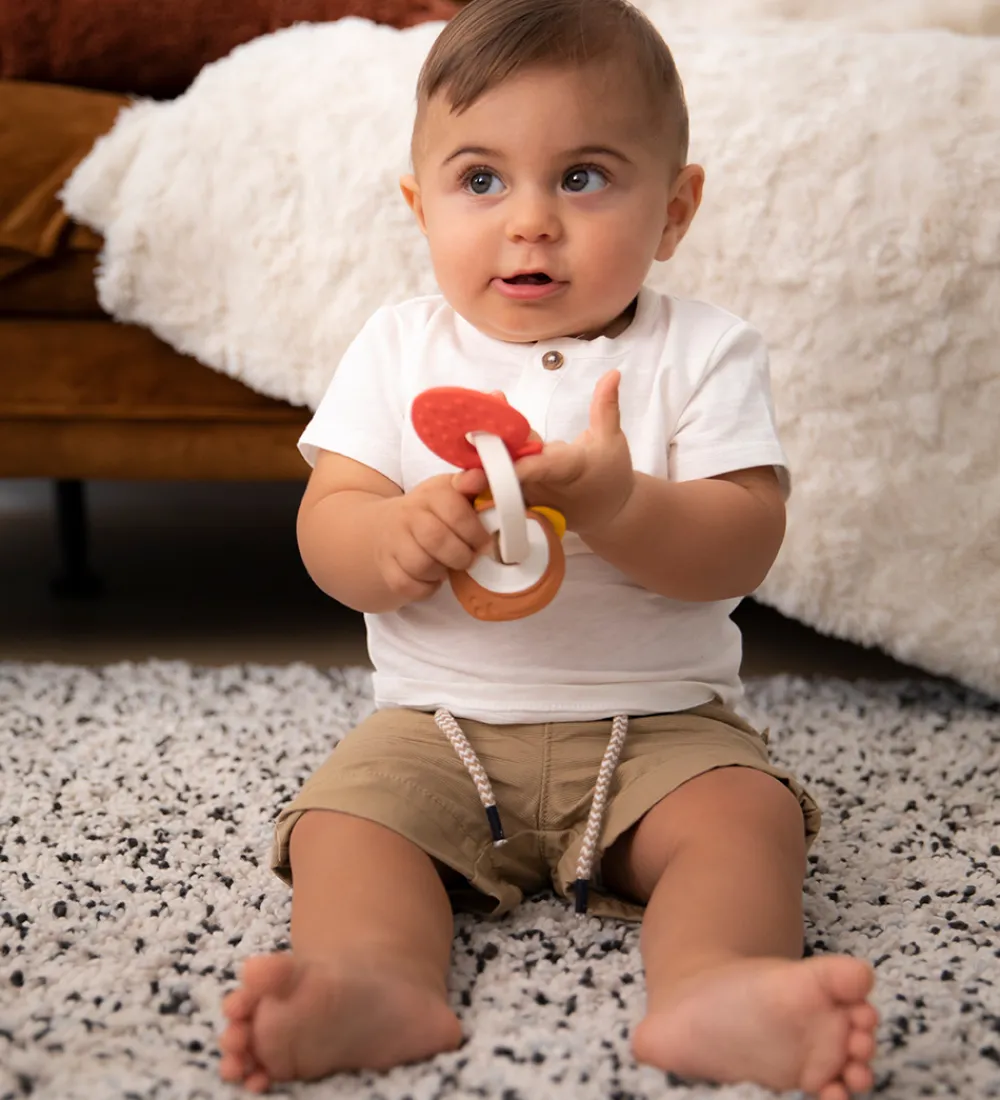 Smart Sophie la Girafe duftering formet som en giraf i beige med tre ringe formet som et rød jordbær, en brun kokosnød og en gul blomst.